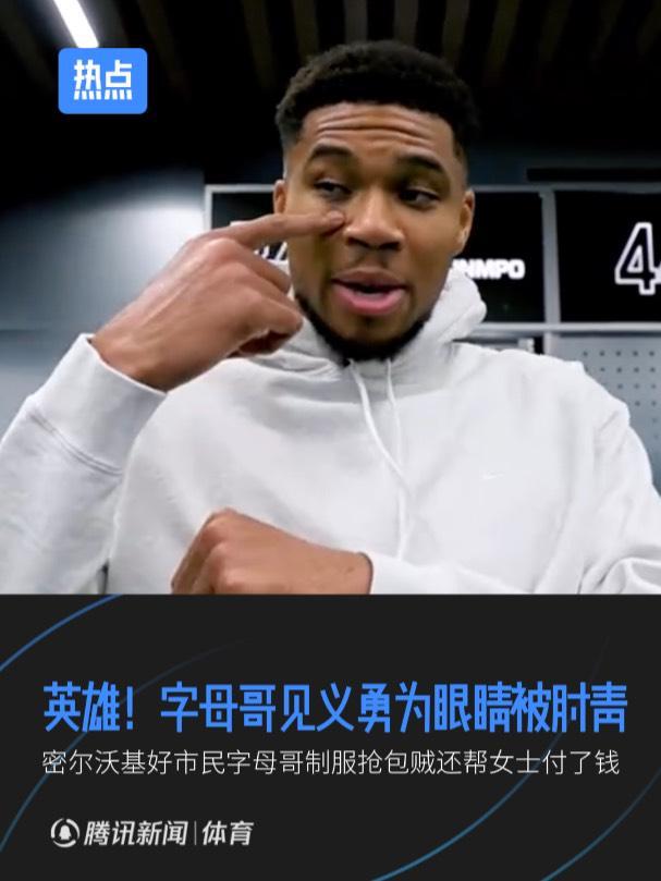 在比赛结束之后,有记者注意到字母哥眼部有一块淤青,随后字母哥透露了背后的故事,字母哥说:“我当时在超市,正结账的时候,看见有个男的准备抢一位女士的包。我就喊:’喂!你干什么?住手!’我冲过去抓住他,他转身一胳膊肘打到我眼睛上。”